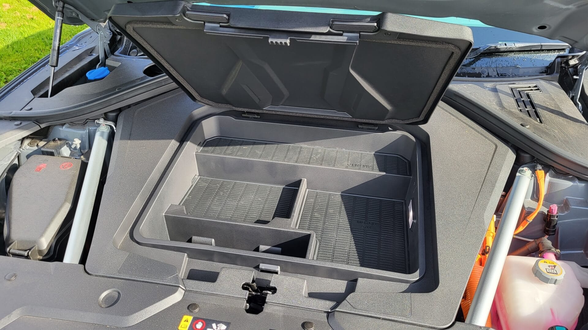 Annoyingly, invasive wheel arches narrow the usable space, but a separate storage box keeps charging cables neatly stowed, and a small 25-litre frunk sits in the engine bay for extra convenience.